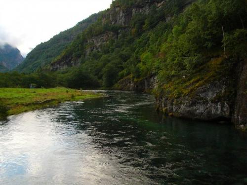 Miejsce powyżej mostu z poprzedniego zdjęcia.Żeby było ¶miesznie -spining jest tam zabroniony,natomiast dozwolone jest łowienie na muchę i ...kto zgadnie?Tak!Na robaka (z 2-gramowym obci±żeniem)!Ryby widać wszędzie.Norwegia to dziwny kraj.