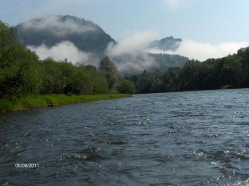 Podnosi się mgła. W tle Macelowa Góra i Trzy Korony.