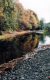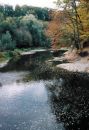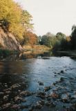 Kanion. Trafiam tu po niecałym kwadransie. Prawy brzeg rzeki stanowi pionową skałę, która wchodząc do ciemnej, lecz przejrzystej wody potrafi wzbudzić respekt. Taki tu spokój, że trudno uwierzyć w bliskość dużego miasta. Dodatkowo wybarwione najpiękniejszymi odcieniami jesieni nadrzeczne drzewa i zarośla tworzą dopełnienie tego całego majestatu. Bardzo długa, z prawie stojącą wodą płań poprzedzona jest wąską gardzielą bystrza, która mimo tego, że znajduje się w sporej odległości ode mnie, skutecznie zagłusza wszelkie symptomy bliskiej cywilizacji. Opieram rower o skałę, kładę plecak i robię kilka zdjęć uroczej doliny.