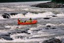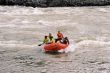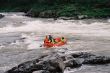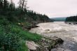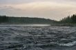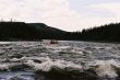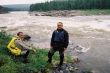 Ruszyliśmy dalej. Woda ciągle podnosiła się. Łowienie stawało się coraz trudniejsze a ryby coraz mniej skłonne do współpracy. Nasze pontony płynęły bardzo szybko , odcinki których przebycie przewidziane było na trzy cztery godziny, pokonywaliśmy w niecałe pół , a wszystko za sprawą podniesionego stanu wody. W niespełna godzinę dotarliśmy do miejsca naszego następnego przystanku miał on miejsce tuż za wodospadem. Powodziowa woda wymuszała na nas zachowanie szczególnej ostrożności. Jeszcze dwa dni wcześniej przeskoczylibyśmy przez wodospad z rozpędu, ale nie dziś, nie przy tej wodzie. Sasza jakieś 300 metrów powyżej wodospadu zarządził postój. Wysiedliśmy na brzeg , w dłonie wzięliśmy kije tudzież inne rzeczy które mogły by przepaść w odmętach Gorbiaczina. Ruszyliśmy nad sam wodospad. Doszliśmy. Naszym oczom ukazał się prawdziwy żywioł. Od razu przywiódł mi na myśl zdjęcia jakie kilka lat temu widziałem podczas powodzi w Chinach. Potężna rzeka przed wodami, której można tylko czuć respekt I strach. Co prawda Igor rysował placem trasą, którą teoretycznie można by przepłynąć, jednak było to tak mało realne, że Sasza spokojnie wysłuchał a gdy ten skończył, powiedział stanowczo- Nie, popłyniemy pod drugim brzegiem. Tam woda była trochę spokojniejsza. . Przepłynęliśmy rzekę I stanęliśmy jakieś 100 metrów od wodospadu.