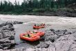 Rozpoczęły się przygotowania do przejścia progu. Najpierw przenieśliśmy w bezpieczne miejsce wędki aparaty I inne rzeczy o których stratę można było się obawiać . Namioty, rzeczy osobiste pozostały w pontonach, tyle tylko, że zostały skrępowane dodatkowymi linami. Szykowała się świetna zabawa. Ja płynąłem w pontonie z Leszkiem, Saszą , Igorem I Loszą. Wyglądało to miej więcej tak. Po pokonaniu wypłyceń I dotarciu do nurtu Sasza zaczął komenderować . Krzyczał , wolno , wolno, wolno, a po chwili dawaj! Wpieot! Wpieot Potem - Wprawo, nazat I tak dalej. A my posłuszni jak ułańskie kasztanki wykonywaliśmy jego polecenia. Wokół nas huczała woda. Wyglądało groźnie. Jednak nasz ponton przepływał pomiędzy bałwanami tak jak by to on słuchał głosu Saszy a nie my. Wszystko trwało chwilę. W niespełna minutę z uśmiechem na twarzy dobijaliśmy do zatoczki za wodospadem. Wyszycy zadwoleni, szczęśliwi na usta cisnęły się nam słowa Veni, Vidi, Vici. Tak zwyciężyliśmy I to w jakim stylu bez strat własnych, bez utraty sprzętu a wyglądało tak groźnie. Rokoszowaliśmy się jeszcze chwilę naszą wygraną, koledzy wskazywali palcem na wzburzoną rzekę, było pięknie. Jednak nasze zwycięstwo jak każda wielka chwila miało swój prozaiczny koniec. Trzeba przystąpić do nudnych ale niezbędnych czynności obozowych, czyli rozbić namioty. Obozowisko rozbiliśmy na dużej półce skalnej. Był to błąd ponieważ tak wybrane miejsce na biwak powodowało, że łowić mogliśmy w zasadzie tylko na przestrzeni 300 m, do pozostałej części rzeki dostępu strzegły pionowe skały. Wysoka mętna woda dodatkowo utrudniała nam uprawianie naszej pasji. Po kilku próbach każdy wracał zrezygnowany I siadał przy suto zastawionym stole. Tylko Felek wykazywał duże zacięcie do zwiedzania bo godzinami w samotności przemierzał kamienisty brzeg Gorbiaczina. Był już zamęczony, podróżą , przeżyciami z poprzedniego dnia. Nic dziwnego mógł najeść się strachu walczył o życie. Ale I on po odbyciu spaceru zasiadł do stołu, zjedliśmy kolacje I poszliśmy spać.