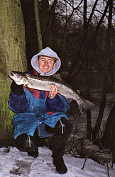 Jeżeli chodzi o pogodę to łowiłem ryby zarówno przy zachmurzonym niebie jak i w pełnym słońcu (m.in. srebrniak 70 cm). Moim zdaniem najważniejszy przy połowie troci jest stan wody. W styczniu najlepsze są stany średnie. Później wiadomo, podczas przyboru wody troć zmienia stanowiska i to jest bardzo dobry moment do łowienia. Najwięcej troci złowiłem między godziną dziesiątą a czternastą. Ujemna temperatura raczej nie ma wpływu na brania i nie wyklucza możliwości złowienia ryby. Jednak podczas mrozów wędkuję rzadko, ponieważ oblodzenie zestawu bardzo utrudnia łowienie i szybko zniechęca...