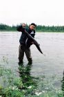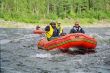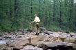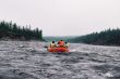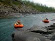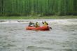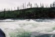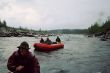Zwijamy graty i na wodę. Rzeka płynie nadal bardzo szybko. Mijane progi ledwo wystają spod spienionych fal. Stajemy poniżej jednego z nich i próbujemy łowić. Rezultatów nie ma, ale znajdujemy pływające przy brzegu pudełko z muchami Marka. Kawał drogi przepłynęło od tamtego progu. Żal, że nie znaleźliśmy cytryn. Trochę na to liczyliśmy. Herbata bez cytryny to już nie to.