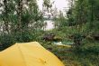 Spływamy trzysta metrów w dół i stajemy przy płaskiej skale po prawej stronie. Rozbijamy namioty. W lesie na górze Robert znalazł dwa pordzewiałe sidła. Leżały na wysoko przybitej na drzewie półce z deski. Jakie zwierzę może tak wysoko wchodzić na drzewa? Chyba tylko rosomak.