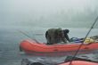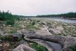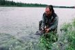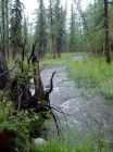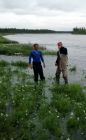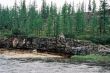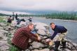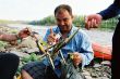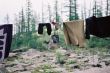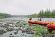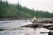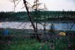 Woda jest tak zmącona, że nie próbujemy na razie łowić. Wczesnym popołudniem stajemy przy lewym brzegu, aby obejrzeć opuszczoną "stajankę geołogów". Trzy małe budynki zbudowane na zrąb. W jednym stoi jeszcze duży żelazny piec - ruska bania. Pusto i wiatr hula w środku. To pierwsze ślady ludzi spotkane po drodze.