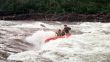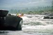 Wracamy do pontonów i przeciągamy je dwieście metrów w górę rzeki. Potrzebujemy większego dystansu, żeby spokojnie przepłynąć na drugi brzeg. Wskakujemy i mocno wiosłując na ukos, pod prąd przechodzimy na prawy brzeg. Teraz pojedynczo na pagajach przeprowadzamy pontony skrajem wodospadu.