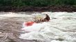 Obijają się pomiędzy dwoma zalewającymi ich falami. Spadająca z progu fala wbija prawy pływak pod wodę, a powracająca z dołu fala unosi lewą stronę do góry.... Na szczęście usiedli natychmiast na lewej burcie. Dzięki balastowaniu utrzymują ponton jako, tako w poziomie. Gdyby siedzieli w środku mogłoby ich obrócić do góry dnem....