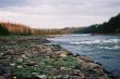 Wieczorem stajemy przy ujściu małego dopływu. Woda jest prawie powodziowa. Zalana jest nie tylko kamienista plaża, ale również część porośniętego trawą wysokiego brzegu. Bez przekonania idziemy do ujścia potoku.