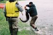 Marek wreszcie powiązał obie linki. Ściągamy sznur i ciągniemy teraz w poprzek prądu, wzdłuż progu. Ruszyło! Za chwilę mamy ich na brzegu.