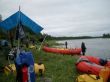 Po pół godzinie woła przez radio. Znalazł jedno wiosło, termos z herbatą i idzie dalej. Wychyla zza chmur słońce i kąpiemy się gruntownie w rzece. Tradycyjnie obok ogniska otwarty salon Canona. Dzisiaj dołączyła cyfrowa kamera Marka. W jednym z obiektywów oprócz pary widać wyraźny osad brudu. Ten już nadaje się tylko na śmietnik. Niezależnie od dzisiejszej kąpieli, każde przejście przez punkt rosy ( a zdarza się to tutaj kilka razy dziennie) owocuje dla naszych Canonów zaparowaniem i pełną dysfunkcją ( dla zainteresowanych podaje modele: Eos Rebel X, Eos 5 i Eos 10).