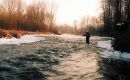 Płań za mostem nie jest głęboka, lecz bardzo atrakcyjna i właśnie w niej przeważnie zaczynam swe spotkania z rzeką. Miejsce tworzy wartkie bystrze, przechodzące w umiarkowanie płynącą rynnę, którą najlepiej penetruje się daleką nimfką. Na wlewach możemy trafić lipienie oraz klenie. Te drugie wręcz uwielbiają niewielkie mokre muszki w oliwkowych kolorach tułowia.