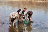 W piątek 16-tego kwietnia na Sanie odbyło się pierwsze zarybienie. Do Sanu na płań w Bachlawie wpuściliśmy kilka pstrągów potokowych i dwie głowacice, które kilka dni wcześniej zostały odłowione w jednym z potoków w celu pozyskania ikry. Podczas zarybienia obecni byli między innymi Piotr Konieczny, zabiegany, bo właśnie świnka się trze i Robert Tobiasz również zabiegany, bo walka z kłusownikami trwa.