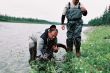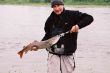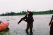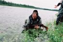 Pierwsze kilometry spływu też nie przyniosły zmian. Jakieś lipionki po 50 cm, nic wielkiego. Tajmienia ani hu hu. Coraz mniej czasu spędzaliśmy na łowieniu, coraz więcej na podziwianiu nostalgicznej przyrody półwyspu. W takiej to atmosferze upłynął kolejny dzień spływu. Pewnie nie warto było by o nim nawet wspominać gdyby nie to, że była to nasza ostania noc nad rzeką. Szasza chciał nam choć trochę poprawić humory. Zaproponował postój w pewnym miejscu szczupakowym. Połowicie sobie niezłe szczupce - powiedział. Chłopakom od razu uśmiech wrócił na twarze. Ja do szczupakowego miejsca podszedłem z rezerwą. Szczupak to nie tajmień – nie ciągnie tak, a poza tym rzadko przekracza metr. Ale jak to mówią na bezrybiu I metrowy szczupak ryba. Dla mnie to tylko ryba ale dla Roberta szczupak to Szczupak, zębaty, szczupiec czy jak go tam zwą, jednym słowem ryba pierwsza klasa. Swoje umiłowanie do szczupaków wyraził tym, że wyskoczył z pontonu jeszcze jak woda sięgała po kolana. W ręku trzymał wędkę a na końcu żyłki pewna szczupakowa blacha. Przebiegł parę metrów stanął nad wodą. Rzut. I krzyczy. Jest. Wędka Roberta wygięta. Walczy. Wszyscy zwrócili wzrok w jego stronę. Wyczekują widoku metrowca. Może więcej. Po chwili Robert ma już rybę przy nogach. Podbiegam. Patrzę. Oczom nie wierzę. To nie szczupak to tajmień. Nie za wielki taki z 80 cm ale to Tajmień. Nasze serca napełniają się na nowo energią , którą wydawało się że utraciliśmy. Czas nie jest stracony, odnaleźliśmy sens. Już po chwili wszyscy stoją na brzegu, wszyscy chcą przeżyć jeszcze raz spotkanie z Tajmieniem.
