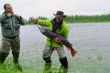 Ale I tego typu eldorado musi się skończyć po półgodzinie brania wyraźnie słabną. Bierzemy się do rozbicia namiotów. Rozpalamy ognisko. Wydawało by się, ze to już koniec naszych zmagań z rybami, jednak jak zawsze niezawodny w takich sytuacjach Sasza mówi- niedaleko jest jeziorko są tam ładne szczupaki I okonie. Podpalam się. Szczupaki szczupakami ale okonie to lubię, chytre bestie. Próbuje namówić Sławka na wspólną wyprawę. Nie da rady. Uderzam do Roberta. Mówię – SZCZUPAKI. Robert załapuje. Idziemy na szczupaki I okonie. Jeziorko oddalone jest jakieś 3 kilometry od obozowiska. Czasami trzy kilometry może wydawać się 5 a czasami 10. Nad to jeziorko było ze 20, bo przedzieranie się przez krzaki w których czatowały na nas chmary komarów zabrało nam tyle czasu co przejecie suchą szosą dwudziestu kilometrów.