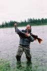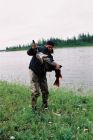 Z moich doświadczeń wiem, że nadzieja na wyciągnięcie kilku tajmieni z jednego dołka jest płocha. Tajmien to nie ryba stadna tak jak pstrąg, lipień, czy łosoś. Ale co tam doświadczenie, czasami zawodzi, nadzieja nigdy. Staje obok kolegów. Rzucamy. Za chwilę Sławek coś zahacza, duża ryba. Udało mu się myślę. Rzucam w prąd. I buch. Siedzi. Sławek walczy ze sporą rybą. Ja na haku też mam kolosa. Schodzimy z nurtem. Po chwili Sławek ląduje ponad dziesięcio kilowego tajmienia. Ja swojego jeszcze nie mogę. Walczy. Schodzę niżej. Po chwili ma go przy nogach. Jest duży. Macha ogonem, odchodzi na kilka metrów. Walczymy. Znowu mam go pod nogami. Krzyczę podbierak. Nie ma. Sławek chwyta go bogagripem. Wyciągamy go. Olbrzym ma z 15 kilo, a na pewno pow. 30 funtów. na Sławka bogagripie brakuje skali. Szasza przynosi wagę. 15,5 kg !. Może nie największy z jakim się spotkałem ale cieszy oko. Robimy zdjęcia. Puszczam rybę.