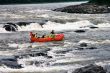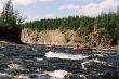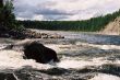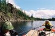 Ruszamy i kilka kilometrów dalej na prostym, głębokim odcinku zacinam coś większego. Lekki spinning wygięty w głęboki łuk. Tajmien? Podnoszę wędkę i piękna czerwona ryba skacze wysoko ponad wodę. Ma około sześć kilogramów. Odczepia się zaraz po skoku. Nic dziwnego. Malutka obrotówka (nr.3) i kotwiczka z zagiętymi zadziorami. Piękne pożegnanie z rzeką.
