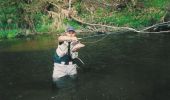 Teraz Andrzej zajmuje rynnę. Z wysokiego brzegu obserwuję, jak podaje rool castem streamerka pod drugi brzeg, a następnie prowokującymi skokami sprowadza go do siebie. Po chwili, jak w zwolnionym filmie widzę wyjście pstrąga spod korzenia. Ryba jednak w muchę nie trafia. Chwila przerwy i kolega podobnie lokuje muchę, dokładnie tam gdzie chce. Głośne „prask” i siedzi. Podobnie jak moje jelce, pstrąg Andrzeja jest równie ciemny i „umięśniony”. Nie ma z tymi malszeckimi rybami żartów.