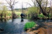 Andrzej zaczyna łowić, a ja idę w dół biegu rzeki, licząc na spotkanie bardziej czytelnych miejscówek. Pierwsze bystrze wygląda obiecująco. Majestatyczna woda napotyka tu na żwirowy garb, wypłyca się nieco, rozszerza i przyspiesza. Decyduję się spenetrować miejscówkę mokrą muszką. Kilkunastominutowe biczowanie nie przynosi skutku.