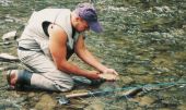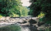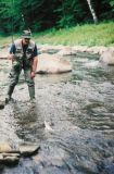 Wacław łowi następną rybę a ja wylewam wodę i suszę się. Na szczęście nie odnoszę żadnych strat. Dokumenty i aparat fotograficzny mam dobrze zabezpieczone. Po chwili idziemy w dół rzeki, gdzie zaskakuje nas jej różnorodność. Usiane głazami, szalone bystrze kończy się mulistym zakolem ze stojącą wodą. Za nim próg, głazy i znowu bystrza. W nurcie biorą mi drobne pstrążki, mam też jednego lipienia, który w końcowej fazie holu uwalnia się sam. A za to w zakolu widzę jak czujne klenie „jeżdżą” w sobie wiadomym celu. Nie przeszkadzam im.