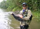 Ustaliliśmy wcześniej z Tośkiem, że on będzie głównie łowił streamerem a ja nimfami. Jednak obaj założyliśmy na początek streamery. W miejscu gdzie mieliśmy łowić Orawa podchodziła pod samą drogę. Schodząc z miejsca, gdzie stał autokar mieliśmy bardzo ładne prądy wlewające się w dużą „banię”. Antek poszedł w górę i z drugim Włochem przeszli na druga stronę rzeki. Ja zacząłem w miejscu gdzie się zatrzymaliśmy, jednak od strony drogi. Miałem linkę intermediate i dwie imitacje pijawek w kolorze brązowym