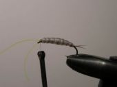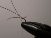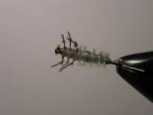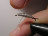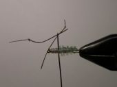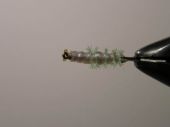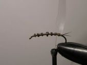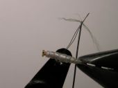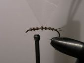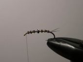 Krok 7 Kolejny krok to nadanie naszej nimfie efektu segmentacji, ja to zrealizowalem zaciskajac miedzy olowianymi pierscionkami dosc silnie zylke. Jak wczesniej opisywalem , matarial ten odksztalca sie mechanicznie na tyle trwale ze przy tej czynnosci wymagana jest precyzja, ktora to wplynie na caly efekt naszej pracy. Ja sie przy tej nimfie nie przylozylem i efektem sa niesymetryczne segmenty. |
