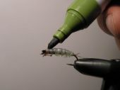 Zapomnialem w tekscie dodac, ze malowac mozna takze w trakcie skrecania tulowia, dzieki temu efekt kolorystyczny bedzie bardziej stonowyny a kolor bedzie wychodzil jakby z wewnatrz owada. Ale dobry pisak typu edding nie sciera sie tak latwo. A jesli chodzi o zabki, to dzieki temu ze "folia skleja sie " korpus nimfy staje sie stabilny i wytrzymaly. Ale dodam, ze setki ryb.... jeszcze nie wyciagnalem. :-)