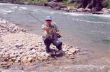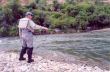 Moje pierwsze starcie z miejscowymi pstrągalami miało miejsce na wspomnianej Thimphu Chhu, około 5 kilometrów w dół od miasta. Rzeka wprawdzie wydawała mi się bardziej interesująca w innych miejscach, ale zezwolenie wyraźnie określa odcinek, na którym można wędkować. W moim przypadku miał on około 4 km. długości i rozpoczynał się od wiszącego mostu zlokalizowanego nieopodal obozu zbieraczy jabłek. Więc gdy tylko zacząłem wywalać z samochodu Dorgji swoje wędkarskie „bambetle”, z miejsca zostałem otoczony przez wianuszek ciekawych, aczkolwiek dość niewielkich wzrostem, kibiców. Część z nich ulokowała się na moście, więc publikę miałem niekiepską. Niemniej Bhutańczycy są znacznie mniej natarczywi od np. Indusów, a i ja łowiąc w tej części świata zdążyłem się już trochę przyzwyczaić do robienia za lokalną atrakcję. W miejscu gdzie postanowiłem zacząć rzeka dzieliła się na dwie dość głębokie odnogi, łączące się dokładnie pod mostem. O przeraźliwej sile jej uciągu przekonałem się zaraz po tym jak mało nie urwało mi nogi, którą wstawiłem do wody głębokiej do kolan. Thimphu Chhu była zresztą wyraźnie podniesiona i zmącona – efekt przeciągającego się monsunu. Pomimo to przebrnąłem przez jedną z płani na wyspę i zacząłem łowić na streamera. Łowić to za mocno powiedziane, bo wściekły prąd rzeki co chwila wyrzucał mi zestaw na brzeg i to pomimo ciągłego poprawiania linki. Dopiero wyspokojenie za wyspą dało mi szansę na jako takie kontrolowanie zestawu. Pierwsze uderzenie w muchę mocno mnie zaskoczyło, tak że praktycznie nie przytrzymałem ryby. Nie było zresztą czego przytrzymywać, bo widziałem jak pod powierzchnią przewrócił się mały, może 20-centymetrowy, pstrążek. Po kilku minutach kolejne branie i tym razem czuję rybę, która po kilku sekundach schodzi. Szkoda, bo ten był już większy. Dalej nie dało się iść, więc powtórnie przeprawiłem się przez rzekę i zszedłem na pierwszą banię poniżej mostu. Gigantyczne masy wody walą tu w dół dość wąskim gardłem i do obłowienia nadaje sie jedynie wąski pas wody przy lewym brzegu, na którym się znajdowałem. Kilka rzutów i ładne branie na praktycznie wyprostowanej już lince. Ryba zaczyna harce w warkoczach prądów i dopiero po kilku chwilach udaje mi sie ją doprowadzić na spokojną wodę a następnie wziąć do ręki. Piękny ponad 40-centymetrowy pstrąg. Ale czy napewno potokowy? W dostępnych mi źródłach znalazłem informację o występowaniu w Bhutanie pstrągów śnieżnych /”snow trout”/. Moja ryba praktycznie nie posiada czerwonych plam, jest mocno wysrebrzona i krępa. Taki prawdziwy mały himalajski rozbójnik z miniaturową kufą na dolnej szczece. Podziwiam rybkę przez chwilę i oddaję ją rzece. Jest to powód późniejszych lamentów Dorgji, który jako prawdziwy buddyjski „hardcorowiec” stworzonka by nie skrzywdził, ale skoro zrobił już to ktoś inny, to zjadłby je chętnie. Będzie jednak musiał poczekać do przyjazdu kogoś innego…
