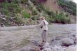 Legła ona w gruzach już następnego dnia, gdy odkryłem, iż inne szczepy, zamieszkujące tereny położone wzdłuż wyższych partii rzeki, lubują się w umieszczaniu na jej dnie i brzegach zupełnie innego asortymentu śmieci i syfu... Tym razem brnę pod prąd po zadziwiająco miękkich, brązowych kamieniach. Zgodnie z powiedzeniem, że czego oczy nie widzą, tego sercu nie żal, można by na nie nie patrzeć. No tak, latwo powiedzieć! Ale jak sie już na takiego „ziemniaka” nastąpi...? No i ta niepowtarzalna woń... Odkrywam też inną teorię, która sprowadza się do wpywu ilości g... na brzegu rzeki na ilość ryb w konkretnych miejscówkach. Otóż czym bardziej o..słane miejsce tym mniej ryb! Czyżby himalajskie pstrągi, bardziej niż autochtoni, ceniły sobie czystość? Być może, ale nie to jest główna przyczyną opisanej sytuacji. Otóż na brzegu Beas w dużej mierze załatwiają swoje potrzeby fizjologiczne miejscowi „gliździarze”, którzy jak na niemal całkowitych wegetarian w zimnym, himalajskim klimacie przystało, jedzą i s...łają, s....łają i jedzą. No i oczywiście łowią. Praktycznie wszystkie miejsca do których da się dojść z brzegu są przeraźliwie puste. I ... obsłane... Ach, gdybym tak mógł tylko być na przeciwnym brzegu! Tam z całą pewnością zabrązowienie kamieni jest mniejsze, woń kwiecia mile uwodzi zmysły a ludziom żyje się lepiej i dostatniej... Moja tęsknota za choćby najmniejszym mostkiem, najbardziej wątłą kładeczką rośnie dodatkowo gdy dostrzegam po przeciwnej stronie Beas dwóch jegomości wyposażonych w ultranowoczesne teleskopy typu „Strieła” czy insza „Katiusza”, taszczących ze sobą pięknego, przynajmniej półmetrowego pstrągala. To powoduje, że jeszcze bardziej przykładam się do roboty, młucąc nimfami każde, najmniejsze nawet, ale rokujące jakieś nadzieje miejsce. Tak dochodzę to muru oporowego zbudowanego z kamieni powiązanych w poteżnych metalowych siatkach. Dalej młucę. Aż tu nagle z małej rynienki przy samiutkim murku wymłucam dwa przyzwoite, ponad 30-centymetrowe tęczaczki. Honor uratowany! Już nie chce mi się dalej łowić. I aby nie powodować u czytelnika uczucia, że tekst ten jest o problemach gastrycznych plemion himalajskich, nie wspomnę dlaczego...