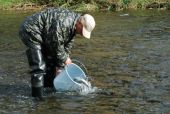 Dzisiaj zarybiliśmy Wisłę selektem lipienia, ryby w granicach 20-26 cm, a zdarzały się i większe. Do wody trafiło 5 000 sztuk tej ryby. W przyszłym roku większość z nich powinna mieć już ponad trzydzieści kilka cm.