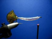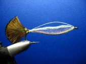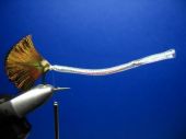 Krok 9 Teraz trzeba wykonać operację formowania mylaru. Chwytamy mylar od góry i dociągamy go w kierunku grzbietu tak, aby na całej długości przywarł do trzonka haczyka. Można teraz BARDZO OSTROŻNIE przytopić mylar na styku z trzonkiem haka zapalniczką. I to miejsce styku przyklejamy potem jakimś klejem typu "kropelka" , czy inny "super glue". |