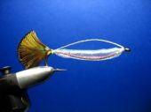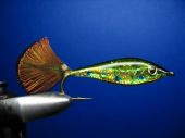 Mylar perłowy, materiał na ogonek( w tym wypadku pióra oczkowe pawia), syntetyczny jedwab dowolnego koloru, brokat jako dodatek do żywicy, kolorowe mazaki, lakier bezbarwny szybko schnacy. No i oczywiście haczyk.