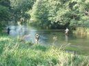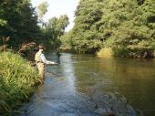 Klucząc wśród kolczastego drutu płotów pastwisk przecięliśmy łuk rzeki pod wioską. Nie wiem dlaczego, ale pogórki i kwaśne łąki nad Łupawą, z żadka porośnięte krzaczkami janowca, przypominają mi Yorkshire i Szkocję. Nad rzeką wspomniałem cięgi, jakie dostaliśmy tu dwa lata temu. Miejscowy specjalista dolnej nimfy pobił nas na głowę. Postanowiłem więc tym razem spróbować szczęścia tą metodą. Już po kilku prowadzeniach miałem zaczep. Ostrożnie podniosłem wędzisko i „zaczep” ruszał się. Zdębiałem, to była ryba. Zanim zobaczyłem mojego być może życiowego lipienia spiął się. Cicho trawiłem porażkę. “Znowu jest, Boże!” usłyszałem za plecami warknięcie Hansa. “Kto?” pytam i patrzę wokoło. “On” odpowiada Hans i pokazuje w górę rzeki. Faktycznie, zbliżał się do nas nasz “pogromca” sprzed dwóch lat. Muszę przyznać, że dla nas, Niemców, „polska dolna” to niecodzienny widok. Muszkarz w kratkę precyzyjnie obrabiał rzekę, prawie co kilka minut holując i puszczając lipienia. Ruchy jego pochylonego wędziska przypominały robota montarzowego lub szczudłaka w przymorskiej mieliźnie. Minął nas z krótkim acz uprzejmym “Dobry!”.