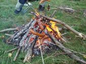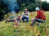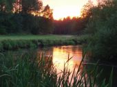 W poludnie trafia się nasza grupa na polanie przy samochodzie. Zaczyna się obiadowy rutuał; zbieramy chrust i Hans rozpala ognisko. Koniecznie on, cieszy się na to jak dziecko. Nikt mu nie przeszkadza. Kiełbaski rumienieją na ogniu. Do tego porządna pajda chleba i musztarda, pycha. No i oczywiście piwko lub dwa. Skrzynka piwa jest na naszych wyprawach tak samo ważna jak wędki. Problem tylko przy łowieniu w spodniobutach. Piwo jest moczopędne. Na deser tradycyjnie orzechowe ciastka mojej żony i kawa z termosu. Boże, jak ja to kocham. Jacek też, mlaska z uznaniem. Po obiadku drugie przejście. Niewinnie pytam Jacka; któredy pójdzie, w górę czy dół rzeki? Idę zawsze w odwrotnym kierunku, dlaczego? Ano, wstyd mi przyznać, że rąbnę się pod następny krzak. Jacek tego nie zna. Myśle, że on umie precyzyjne rzucać nawet 24 godziny na dobę. Przy krzaku na łące rozglądam się w kierunku bazy. Jacka nie widać, więc rzucam manele w prawo a wędke w lewo. Sam kładę się w pośrodku. Kapelusz głęboko w twarz i wędruje w objęcie Orfeusza. Uwielbiam taką sjestę, owady mnie nie rażą. Budzi mnie potężne walnięcie w wodę. To trotka w przewężeniu, conajmniej szóstka. Miejsce znane, ale prawie nie do obrobienia. Dopiero teraz widzę, że druga głowa wychyla się z pożółkłej już trawy, to Hans. Cwaniak, zauważył mnie w „pieleszach” u uznał to za dobry pomysł. „Jeszcze godzinkę?” rzucam w jego kierunku. Potwierdzająco kiwa głową. Prostuję się w trawie. Przed szóstą i tak nic nie bierze, z reguły.