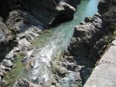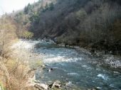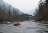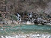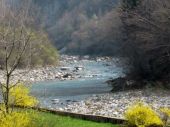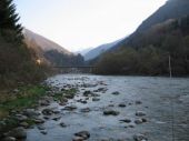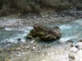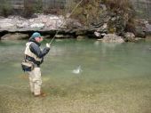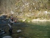 Nad wodą okazało się, że lepsza będzie nimfa. Na dół poszła złotogłówka brązowa na haczyku „10”, żyłka 0,16, a na troku z 0,14 także złotogłówka, ale szara. Rzeka w tym miejscu miała od 15 do 25 m szerokości, dosyć bystra płań z wieloma dużymi kamieniami przechodziła w głęboką, szybką rynnę i bardzo głęboki wlew; tam woda zaczynała zwalniać, aż do prawie całkowitego zatrzymania nad kilkumetrową błękitną głębią. Zacząłem wędkowanie od płani, schodząc w kierunku wlewu i wyszukując interesujących zagłębień. Po pewnym czasie delikatne puste branie. Jeszcze raz zarzuciłem, branie i ładny lipień ok. 35 cm trzepotał na końcu zestawu. Po chwili ryba wróciła do wody, a mnie ogarnęła wręcz euforia, że wreszcie wędkuję. Mój dobry nastrój pogłębiło jeszcze wynurzające się zza gór słońce oraz piękno rzeki i otoczenia. Łowiłem bez żadnego pośpiechu aż do końca wlewu, wchodząc do wody po pachy. Tam miałem potężne branie – dolna nimfa została w pysku ryby. Domenico wspominał, że w tym miejscu łowiono duże „marmorate” (pstrągi marmurkowe występujące tylko w tym rejonie oraz na Słowenii). Wróciłem do hotelu zaniepokojony nieobecnością umówionego towarzysza, gdzie się dowiedziałem, iż już ktoś był i szukał mnie bezskutecznie nad rzeką, a potem odjechał. Nie wiem, jak mógł mnie przeoczyć. W takim razie postanowiłem pójść pieszo drogą w górę rzeki, gdzie znajduje się kilkukilometrowy odcinek „No Kill”. Większość rzeki oraz tam, gdzie łowiłem wcześniej, to strefa ochronna lipienia. Informują o tym gęsto rozstawione tabliczki. Natomiast pstrągi można zabierać, dozwolone jest także łowienie na różnego typu robaki. Po drodze widziałem nielicznych wędkarzy łowiących na spławik długimi wędkami teleskopowymi. Okupowali głównie bardzo głębokie doły z prawie stojącą wodą, więc uznałem, że jeżeli będę łowił poza strefą „No Kill”, muszę postępować zupełnie odwrotnie niż oni.