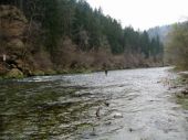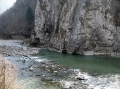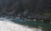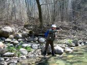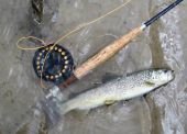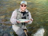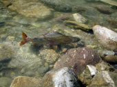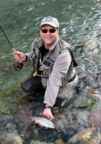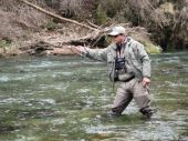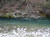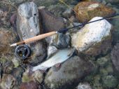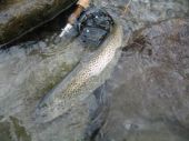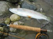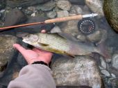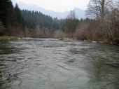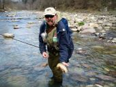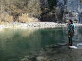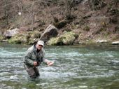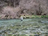 Tymczasem straciłem jedną przynętę po braniu ładnego pstrąga, ale była to z pewnością moja wina, bo przypon był już nieźle porysowany na ostrych kamieniach. Inne chruściki z mojego pudełka w ogóle rybom się nie podobały. Ten superskuteczny został mi tylko jeden, a na dodatek był tak pogryziony, że niewiele przypominał pierwowzór. Zbliżając się do głębokiego wlewu, postanowiłem przebudować zestaw, stosując zamiast fluorokarbonu mocniejsze, zwykłe żyłki, co zresztą w tej nieco mętnej wodzie nie miało znaczenia. Rozsiadłem się wygodnie na wielkim głazie. Dłuższą chwilę odpoczywałem, zanim zabrałem się do pracy, delektując się widokiem rzeki, otaczających ją gór i pierwszymi oznakami upragnionej wiosny. Tutaj tegoroczna zima też była wyjątkowo sroga. Gdy byłem już gotowy, zacząłem przeczesywać początek wlewu, gdzie woda była niezbyt głęboka, za to wartka. Stojąc w wodzie powyżej kolan, sięgałem wędką, jak najdalej potrafiłem, aby precyzyjnie umieścić zestaw na skraju bystrza. Tak stopka po stopce schodziłem z nurtem. W pewnej chwili poczułem „trącenie”, potem kolejne i jeszcze jedno... Nooo nie! O co tu chodzi? Przytrzymałem nieco dłużej muchę w punkcie „zero” i... branie! Tym razem siedzi. Kilka wyskoków i ucieczek z nurtem i już jest ładny pstrąg, ale jakiś taki szary i bez plamek. Okazało się, że to... marmurkowy, mój pierwszy! Zatem kilka fotek, i z powrotem do wody. Jeszcze w tym miejscu, ale trochę niżej, miałem niezłego tęczaka (co jest tutaj większą rzadkością niż marmorata) oraz dwa potokowce i lipienia.