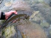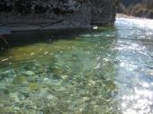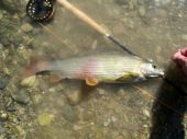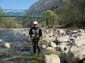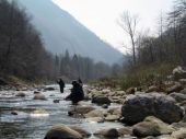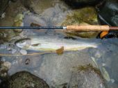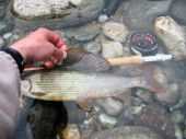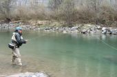 Tak wędrując, dotarłem do celu, po drodze oczywiście odwiedzając przydrożny bar w celu schłodzenia organizmu zimnym piwkiem. Było dość ciepło, ok. 20 st. C i ostre słońce. Wędkowanie rozpocząłem na wysokości dużej hałdy żwiru położonej w pobliżu rzeki, która w tym miejscu była dość szeroko rozlana, tworząc płań, a następnie dzieląc się na trzy płytkie szybkie nurty łączące się poniżej w bardzo interesującym wlewie. Poniżej niego woda się uspokajała, przechodząc w kolejną bardzo głęboką powolną płań. Woda była lekko „trącona”, prawdopodobnie za sprawą prowadzonych kilka kilometrów powyżej robót w korycie, o czym uprzedzał mnie Domenico. Było mi to bardzo na rękę, bo w krystalicznie czystej wodzie trudno podejść do ryb z naszą krótką nimfą, chyba że skradając się na czworaka jak komandos. W tej strefie dozwolone jest wędkowanie tylko na sztuczną muszkę –oczywiście haczyki bezzadziorowe lub z zagniecionym, i tylko na jedną przynętę. Dlatego jedną nimfę w moim zestawie pozbawiłem całkowicie grotu, łamiąc go na wysokości kolanka, tak że tworzyła tylko obciążenie zestawu, niezbędne w szybszym nurcie. Brodząc w korycie, co chwila miałem brania, ale bardzo delikatne i tylko nieliczne ryby, w większości niewielkie pstrągi, udawało się zapiąć. Łowiłem na małą szarą złotogłówkę.