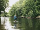 Andrzej mnie wnet ominął, w swoistym dla niego tempie brodził w dół rzeki. Za zakrętem rzeki ukazała się głęboka płań przed pionową skałą. Tu zaczynal się malowniczy przełom Bobru przez Góry Kaczawskie. Na jej wlocie dostojnie machał wędziskiem Janek Błachuta. On jeszcze perfekcyjnie włada klasyczną mokrą muchą, czego mu bardzo zazdroszczę. Z imponująca brodą i finezyjnym kapeluszem wyglądał jak Liczyrzepa osobiście. Stosownie, bo do Karkonoszy nie było daleko. Wcisnąłem wędzisko pod pachę i wyjąłem aparat fotograficzny.