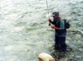 Pewnego wieczoru wybrałem się właśnie nad nią. Już z daleka słyszałem świst, oznajmiający, że tam suszą. Wyszedłem zza kęp wierzb i zdumienie! Tylko jeden muszkarz! Niesamowite! Podchodzę bliżej, widzę że holuję rybę. Tak to lipień. Podchodzę niepostrzeżenie blisko. Lipień jest ładny. Nagle wypina mu się pod samymi nogami. Wędkarze spostrzega mnie. Poznaję go. Już tu kiedyś razem łowiliśmy.