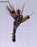 Mnie jednak nie interesował przypadek, chciałem je łowić niejako z wyboru. Swoją drogę rozpocząłem od zawartości treści żołądkowej, lecz i to nie dało mi "złotego środka". Przechodziłem przez imitacje: chruścików, jętek...nawet białych robaków aż wreszcie doszedłem do raków. Ekspansja zwłaszcza raków amerykańskich na nasze wody nie oszczędziła nawet wód górskich. Spotykam je zwłaszcza w Olzie, choć i Poprad nie jest wolny od nich. Właściwie "ameryki" tu nie odkryłem, szyjki rakowe na brzany były zalecane już przez Choynowskiego. Teraz potrzebna była imitacja, i tu znowu pomogli amerykanie ( w końcu to ich gatunek). Eksperymenty rozpocząłem od modelu Al's Crayfish...pozwalając sobie na jego modyfikację. Podstawowymi artykułami są brązowo-czarne siodłowe pióra koguta "liliputa", grafitowa lekko połyskująca folia, rafia, brązowa chenille, lameta ołowiana i hak 6 (2 x long).