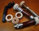 Ad 2. Rodzaj uchwytu kołowrotka zależy od tego co tworzymy. Inne są uchwyty do wędek dwuręcznych (przeważnie większe), inne do wędek z dolnym tzw. dopalaczem (fighting butt), inne do standartowych jednoręcznych muchówek. Generalnie są 2 rodzaje z gwintem na górze (patrząc na szczyt wędki) tzw. downlocking reel seat oraz z gwintem na dole tzw. uplocking reel seat. Standardy do jednoręcznych kijów są zakończone od dołu na „ślepo”. Jak chcemy wybrać wariant z dopalaczem to kupujemy uchwyt z otworem wewnętrznym z tyłu, nie zaślepiony. Czasem ma on również gwint wewnętrzny, to czy go wykorzystamy zależy od konstrukcji dopalacza. Należy jeszcze pamiętać o kupieniu zaślepki (grosze kosztuje, no może centyJ), którą założymy kiedy nie używamy dopalacza wkręcanego. Dopalacz można kupić gotowy, ładnie wykończony i tu zwracamy uwagę żeby końcówka (nakręcana na dopalacz tuleja) nie była szersza od średnicy wewnętrznej uchwytu kołowrotka. Ja przynajmniej spotkałem się z takim, że miał wystający nagwintowany bolec, na który nakręcona była tuleja. Tą tuleję należało na stałe wpasować od tyłu w uchwyt kołowrotka i tu nie był mi potrzebny gwint wewnętrzny uchwytu kołowrotka, aczkolwiek lepsze jest tu połączenie z tuleją na klej, większa jest odporność na moment skręcający powstający przy użytkowaniu, gwint dodatkowo wzmacnia połączenie klejone. Stąd ta wcześniejsza uwaga by tuleja zmieściła się do wewnątrz uchwytu. Nie przejmujcie się jak będzie różnica w drugą stronę, tzn. tuleja będzie wyraźnie mniejsza- lukę wypełnimy taśmą maskującą, ale o tym i jeszcze innych ważnych rzeczach w tym przypadku później jak będzie o wykonawstwie. Są na pewno inne rodzaje dopalaczy, ale jak wiecie mam tylko jednorazowe doświadczenie. Dopalacz można również zrobić na stałe na końcu blanku, nie przedłuży on wtedy kija a przesunie uchwyt kołowrotka lekko do góry lub zrobić go na np. kawałku starego blanku co również pozwoli nam nieco wydłużyć dolną sekcję, ale wtedy sekcje staną się nierówne jeżeli zrobimy go na stałe. Nie wiem więc czy to dobre rozwiązanie. Dopalacz przykręcany wydłuży nam nieco wędkę i zachowa długość sekcji.