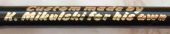 Tego chyba nie możemy sobie odmówić. Cała przyjemność po naszej stronie jak sobie napiszemy, że to wykonaliśmy wędkę dla siebie. Techniki są różne. Najczęściej spotykana to pismo odręczne wykonane czymś, czym się da pisać na blanku i co musi zaschnąć, a później to polakierujemy dla ochrony przed zdrapaniem. Ja zastosowałem niekonwencjonalny sposób, przynajmniej u nikogo takiego jeszcze nie widziałem. Otóż mam swój ploter tnący do folii, który postanowiłem wykorzystać. Ponieważ chciałem mieć złoty kolor dominujący wśród komponentów (nici, przelotki, częściowo uchwyt kołowrotka), chciałem również mieć złoty napis na blanku. Ale skąd wziąć coś co pisze na złoto? Wpadłem na pomysł by zrobić go z folii samoprzylepnej. Wybrałem sobie czcionkę i w Corelu odpowiednio dopasowałem napis do blanku. Napis jest mały więc czcionka nie może być za delikatna, również ploter ma pewne ograniczenia co do min. wielkości wycinanej czcionki poniżej, której wytnie ją niedokładnie z błędami. Ja mogłem testować, wam jak chcecie, polecam zrobienie go jak największego odpowiednio do średnicy blanku, oczywiście by wyglądało to przyzwoicie i nie oplatało blanku dookoła, zróbcie próbny wydruk. Kupiłem cienką złotą folię lustrzaną i wyciąłem napis. Wy możecie z gotowym plikiem na dyskietce pójść do najbliższej agencji reklamowej i tam to wyciąć. Oni też przeważnie pracują w Corelu i mają ploter tnący do robienia reklam. To trwa krótką chwilę. Poustawiajcie sobie w pliku kilka napisów obok siebie, w razie jakbyście krzywo jeden przykleili to będą następne na zapas. Ploter tnie to kilkanaście sekund dłużej, a będzie to jakieś zabezpieczenie. Powinni wam to wyciąć za darmo jak będą w porządku. Jakby nie wychodziło, powiedzą wam, że za małe, to powiedzcie im, żeby ustawili prędkość cięcia na możliwie minimalną. Proste przyklejenie wcale nie jest łatwe, napis można wpisać w prostokąt a blank jest okrągły i jeszcze się zwęża. Sam próbowałem kilka razy przyklejać, aż mnie efekt zadowolił. Trudność rośnie proporcjonalnie do długości napisu. Robiąc napis w komputerze staramy się go zrobić w całości do przyklejenia, po to, by wszystko było równo względem siebie. Na napis nałożymy prostokątną ramkę, blisko brzegu napisu, którą ploter też wytnie. Mając folie wyciętą, wybieramy za pomocą szpilki tło napisu, czyli wnętrze tej ramki bez napisu oraz środki liter. Ma zostać sam napis taki jak ma być na wędce. Teraz przeźroczystą taśmę klejącą z niezbyt silnym klejem (jak jest za silny to przyłóżmy ją raz do spodni i oderwijmy) przykładamy do napisu i odrywamy całość (napis i taśmę) od papierowego podkładu. Naklejamy do na blank, masujemy i delikatnie odrywamy taśmę klejącą. Ewentualne resztki kleju z taśmy również usuwamy, uważajmy przy tym by nie porysować folii. Mamy gotową inskrypcję, a tak to po części wygląda: