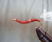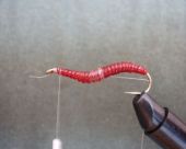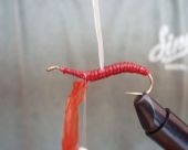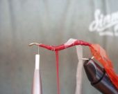 Krok 9 To zdjęcie pokazuje muchę bez przewijki żyłkowej, ciekawostką jest to, że w każdej z trzech powyższych much zastosowano inny kolor latexu czerwony, blado pomarańczowy i pomarańczowy. Latex body jest stosunkowo przeźroczysty i zastosowanie różnych kolorów nie miało większego wpływu na kolor muchy. |