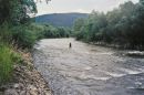 Znowu bystrza, wszystkie ciekawsze miejsca są puste. Dziwne to, ale tu już nie ma nawet drobnicy. Za chwilę dochodzę do pięknego przełomiku. Na nowo wracają nadzieje. Rzeka tu przyspiesza, jej dno to goła, poszarpana skała, w której woda zdążyła wybić kilka ponadmetrowych dołów. Streamer jednak nie kusi tu żadnej, nawet drobnej ryby. Pierwszy dół nic drugi, kolejny – podobnie. Za chwilę widzę, że nie jestem sam. W dole widzę łebka z długą wędką teleskopową. Drugi kibicuje mu na brzegu. Za chwilę pokazuje palcem w moją stronę i obaj znikają. Jak duchy. Zostaję znowu sam.