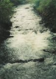 Energetyk. To kolejne miejsce. Notabene jedyne w swoim rodzaju na górnej Skawicy. Rzeka ma tu potwornie wielki spadek, przez co atakuje wychodnie skał z niewyobrażalną siłą. W rezultacie powstało kilka dołów, w tym jeden tak potężny i głęboki, jakiego żadna z najznamienitszych naszych rzek by się nie powstydziła. Dziura ta (dobre trzy metry głębokości) z jednej strony ograniczona jest pionową ścianą na której stoi budynek domu wczasowego. Drugi brzeg jest bardziej dostępny, ale trzeba do niego się spuścić po skałce (idąc z góry) Od lat miejscówka ta nie ulega zmianie. Górny dołek, powyżej mostu zaskakuje mnie totalną pustką, dolny na początku skąpi, ale jego obławiam dokładniej. W efekcie wyciągam drobnego tęczaka i oblepione chruścikami coś, co kiedyś było ręcznikiem. Więcej brań nie miałem!!! A pogoda i woda idealna. Dodatkowo komuś chyba bardzo nie podobam, bo z któregoś z okien spada mi koło szczytówki plastikowa butelka! Patrzę do góry, trzy okna otwarte. Z którego poleciała?