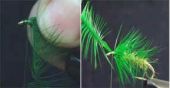 Pierwszym krokiem jest rozchylenie promieni pióra, następnie końcówkę pióra przymocowujemy do muchy za pomocą nici. Teraz następuje najistotniejszy moment w kładzeniu jeżynki. Wszystkie promienie zciskamy na jedną stronę. Tak przygotowane pióro wygląda jakby z jednej strony usunięto mu promienie.