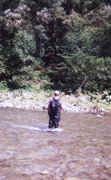 Ponownie nad rzeką znajduję się nieco poniżej ośrodka energetycznego, (dom przy skale nad rzeką). Skawica rwie tam tylko po skalnych płytach i ma kilka głębokich dziur. Rójka niesamowita. Po prostu rzeka jest gęsta od jętek. Widać także pojedyncze, jasne chruściki. Na jednej płani widzę wyjście,. Zmieniam na suchą, podaję i mam pięknie wybarwionego potokowca z tej rzeki. Pstrąg jest niewielki, ledwie 28 cm, ale za to bardzo gruby, silny i pięknie wybarwiony. Wypuszczam go i niżej udaje mi się złowić jeszcze kilka, ale ich wielkość do znacznych nie należy. Niżej spotykam dwóch kłusoli. Łowią jawnie na robaka, a na brzegu mają "ochronę"...